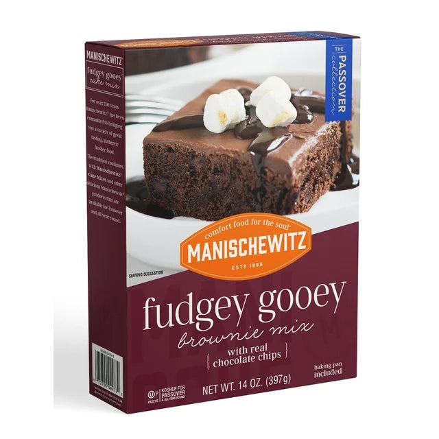 Manischewitz Fudgey Gooey Brownie Mix, 14.1oz Brownie mix with real chocolate chips. Baking pan included. Celebrating 130 years of crafting kosher foods. For over 130 years Manischewitz has been committed to bringing you a variety of great tasting, authentic kosher food. The tradition continues with Manischewitz cake mixes and other delicious Manischewitz products that are available for Passover and all year round.