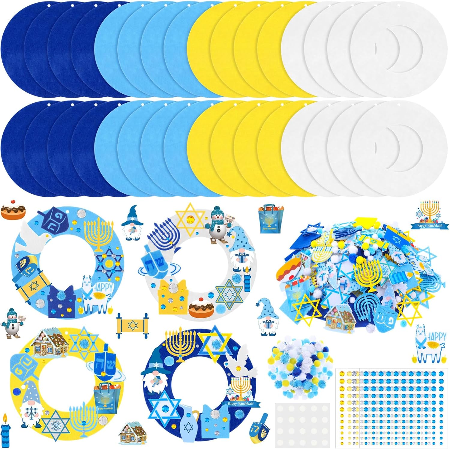 472 Pcs Hanukkah Craft Kits Hanukkah DIY Wreath Craft Kit Chanukah Wreath Arts Decorations with Menorah Dreidel Gnome Stickers for Indoor Outdoor Home Party Favors